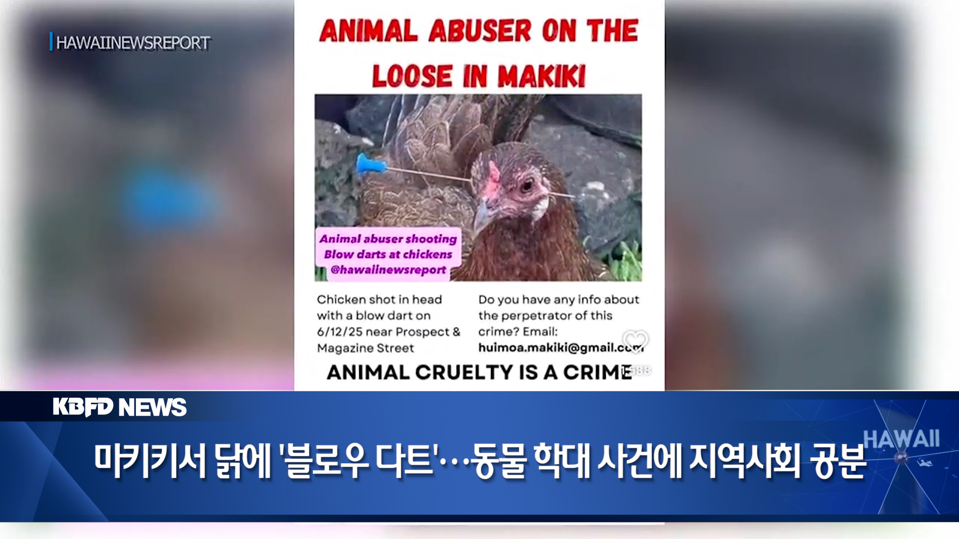 호놀룰루 마키키 지역에서 닭을 대상으로 한 잔혹한 행위가 발생해 지역사회가 크게 반발하고 있습니다. 최근 마키키의 프로스펙트 스트리트와 매거진 스트리트 인근에서 닭들에게 블로우 다트를 쐈다는 신고가 잇따라 접수된 것으로 확인됐습니다. 특히, 목에 다트가 박힌 채 살아 있는 닭의 사진이 소셜미디어에 퍼지면서 시민들의 분노는 극에 달하고 있습니다. 사진을 본 마키키 주민들은 “이런 일이 실제로 벌어졌다는 것 자체가 충격적이다”, “말도 안 된다”는 반응을 보이며, 이번 사건에 대해 깊은 실망감을 드러냈습니다. 하와이 휴메인 소사이어티는 이번 사건이 2급 동물 학대에 해당할 가능성이 크다고 밝혔습니다. 하와이 법상 개인이 자신의 땅에서 닭을 죽이는 행위는 원칙적으로 처벌 대상이 아니지만, 고의적인 위해 행위로 판단될 경우에는 최대 1년 징역형과 2천 달러 벌금에 처해질 수 있습니다. 휴메인 소사이어티 관계자는 “블로우 다트와 같은 도구로 동물을 해치는 것은 명백한 학대”라며, “하와이에서 이런 일이 벌어지고 있다는 사실 자체가 충격적”이라고 강하게 비판했습니다. 한편, 마키키 주민들 사이에서는 닭과 비둘기를 두고 의견이 갈리고 있습니다. 이 지역에는 매일같이 새들에게 먹이를 주는 주민들이 있는가 하면, 소음과 위생 문제 등을 이유로 닭들을 불편하게 여기는 목소리도 존재합니다. 일부 주민은 닭과 비둘기의 과도한 번식, 그리고 진드기나 병원체 확산 가능성에 대해 우려를 표하기도 했습니다. 당국은 닭 제거가 필요한 경우 전문가의 도움을 받는 것이 바람직하다고 조언하고 있습니다. 관계자들은 동물 학대와 인간 대상 폭력 사이에 상관관계가 있다는 연구들을 언급하며, 이번 사건은 단순히 동물의 문제가 아니라 지역사회 전체가 함께 인식하고 대응해야 할 심각한 문제라고 강조했습니다.