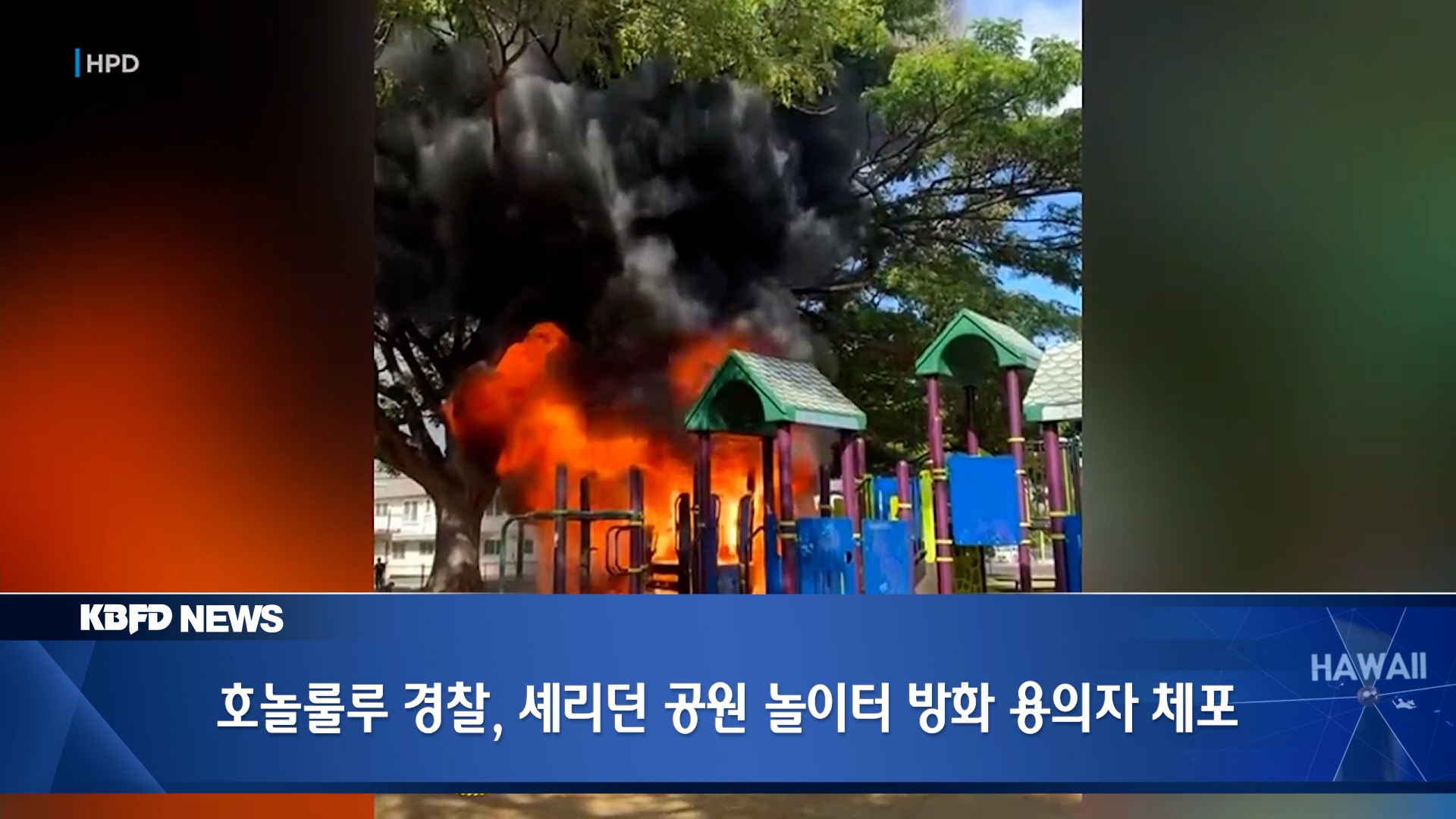 호놀룰루 경찰은 지난 6월 30일 월요일 셰리던 커뮤니티 공원 놀이터에서 발생한 방화 사건의 용의자를 목요일에 체포했습니다. 경찰에 따르면, 현장 인근 CCTV에 28세 남성이 화재 발생 시점에 포착되었으며, 현장 근처에서는 인화성 액체도 발견되어 방화 가능성이 높다고 보고 있습니다. 용의자는 1급 방화 혐의로 구금된 상태이며, 추가 혐의는 현재 조사 중입니다. 한편 경찰은 이 사건에 대해 정보가 있는 주민은 호놀룰루 경찰(808-935-3311)로 연락해 줄 것을 당부했습니다.
