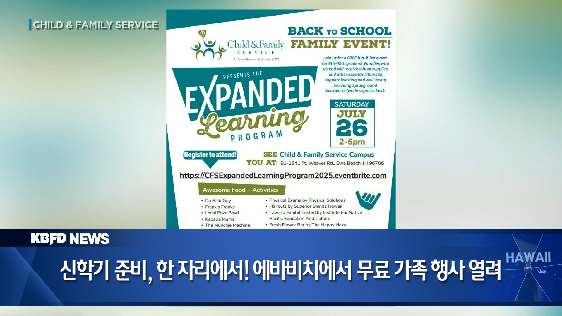 비영리 단체 차일드 앤 패밀리 서비스(Child & Family Service)는 오는 7월 26일 토요일 오후 2시부터 6시까지, 에바 비치 오피스(91-1841 Ft. Weaver Rd.)에서 무료 ‘Back to School’ 행사를 엽니다. 이번 행사는 중·고등학생(6~12학년)을 대상으로 하며, 백팩을 포함한 다양한 학용품이 무료로 제공됩니다. 수량은 선착순입니다. 또한 현장에서 무료 신체검사와 함께, 전문 이발 서비스도 받을 수 있습니다. 가족들이 함께 즐길 수 있는 다양한 체험 활동도 준비돼 있습니다.