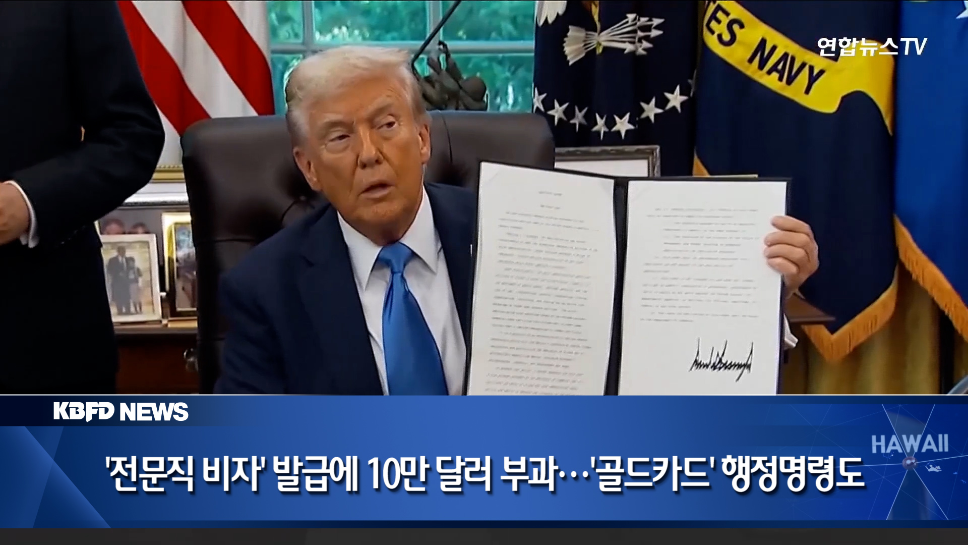 트럼프 대통령은 오늘 백악관 집무실에서 H-1B 비자 프로그램을 대대적으로 개편하는 내용의 포고문에 서명했습니다. 이른바 ‘전문직 비자’로 불리는 H-1B 비자는 과학·기술·공학·수학(STEM) 분야의 전문 직종에 적용되는 취업 비자로, 추첨을 통한 연간 발급 건수가 8만 5천건으로 제한돼 있습니다. 기본 3년 체류에 최대 6년까지 연장이 가능하고, 영주권 신청도 가능합니다. 트럼프 대통령의 포고문 서명으로 기존 신청 수수료 1천 달러의 100배에 달하는 금액으로 수수료가 인상됐습니다. 심지어 1인당 1년치에 해당하는 금액으로, 체류 기간 매년 같은 금액의 수수료를 내고 갱신해야 해 발급 부담은 더욱 커지게 됐습니다. 트럼프 대통령은 H-1B 비자를 통해 기업들이 중국이나 인도인 등 외국 인력을 저렴한 비용으로 데려와 미국인의 일자리를 빼앗는다고 밝혀왔습니다. 한편, 트럼프 대통령은 이날 새로운 미국 영주권 비자인 ‘골드카드’ 관련 행정명령에도 서명을 마쳤습니다. 백악관 관계자는 이 행정명령에 대해 “미국에 진정으로 기여할 수 있는 진정 탁월한 인재들을 위한 새로운 길을 열어주는 것”이라면서 “미 재무부에 100만 달러를 납부하거나, 기업이 후원할 경우 해당 기업이 200만 달러를 내면 이 새로운 골드카드 프로그램의 일환으로 신속한 비자 처리 혜택을 받게 된다”고 설명했습니다.