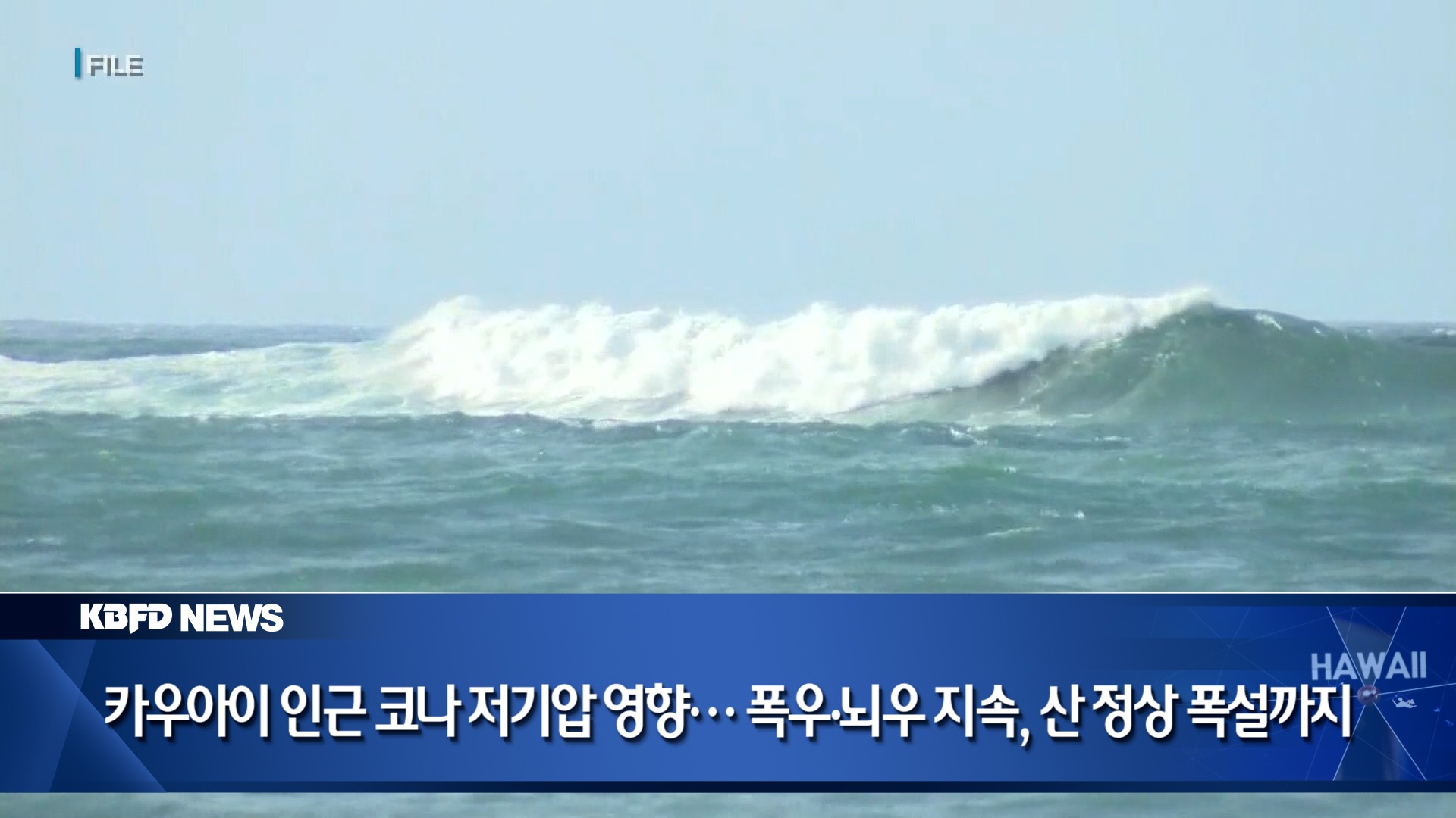 카우아이 북서쪽 해상에 위치한 코나 저기압의 영향으로 하와이 전역에 폭우와 뇌우가 이어지고 있습니다. 특히 이번 주 초까지 돌발 홍수 위험이 계속되는 가운데, 빅아일랜드 산 정상에는 상당한 눈과 얼음이 쌓일 것으로 예보됐습니다.