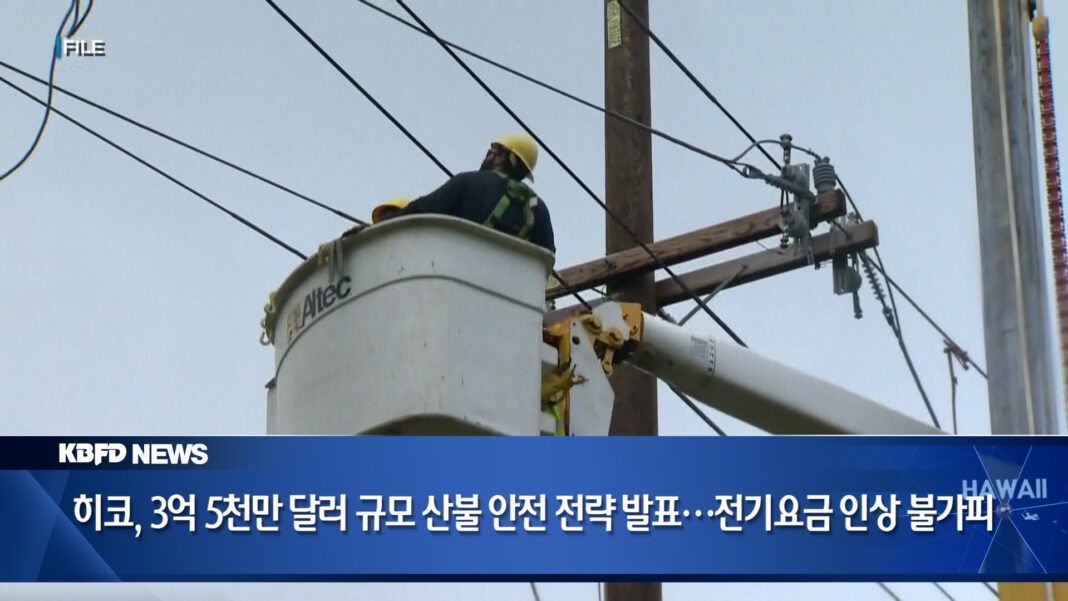 하와이 전기회사 히코가 3억 5천만 달러 규모의 3개년 산불 안전 전략을 공개했습니다. 이번 계획안은 산불 위험을 줄이고, 하와이 전역의 전력망 복원력을 강화하는 데 초점을 맞추고 있으며, 마우이 지역을 가장 높은 위험 지대로 지정해 집중 투자할 방침입니다. 히코는 이 계획안을 주 공공요금위원회(Public Utilities Commission)에 제출했으며, 계획이 승인될 경우 오아후는 매달 1달러, 빅아일랜드는 매달 3달러, 마우이는 매달 5달러씩 인상될 것으로 전망됩니다. 히코는 전체 예산의 절반 이상인 약 1억 8천 100만 달러를 마우이 카운티에 집중 투입할 것으로 보이며 올해 안에만 1억 3천 700만 달러 규모의 사업이 진행될 예정입니다. 이번 계획안의 주요 내용으로는 덮개가 씌워진 전선 설치 및 견고한 전봇대 교체, 위험한 나무 제거 작업 확대,