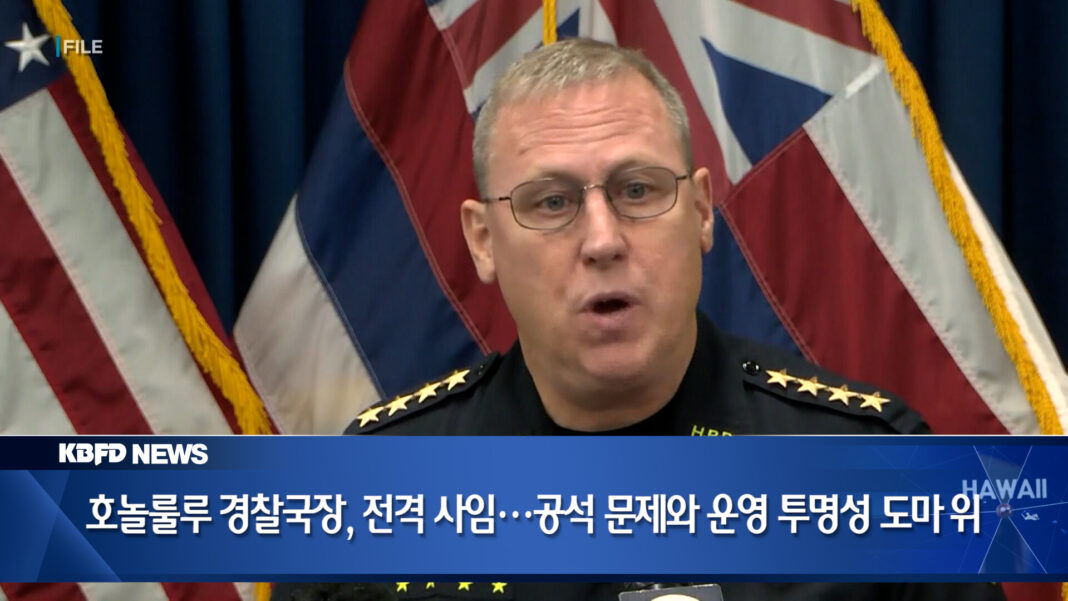 호놀룰루 경찰국의 수장인 아서 조 로갠 국장이 전격 사임을 발표했습니다. 3년도 채 되지 않은 재임 기간 중 이뤄진 이번 결정은, 경찰관 공석 문제와 경찰국 운영의 투명성 부족 등에 대한 비판이 영향을 미친 것으로 보입니다. 경찰국은 후임 국장 선출을 위한 절차에 돌입했습니다.