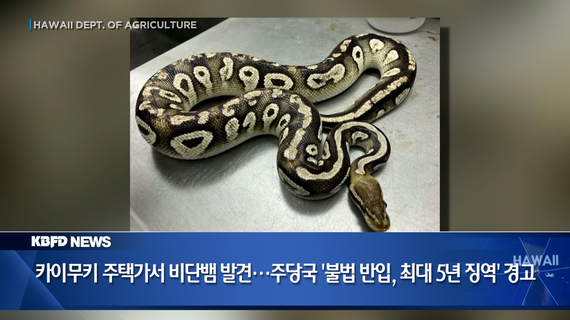 지난 일요일 밤, 호놀룰루 카이무키의 한 주택 뒷마당에서 비단뱀이 포획되는 일이 있었습니다. 하와이에서는 뱀을 반입하거나 기르는 것이 불법인데요, 다행히 해당 뱀은 독이 없는 종으로 확인됐지만, 주당국은 엄정한 대응 방침을 강조하고 있습니다.
