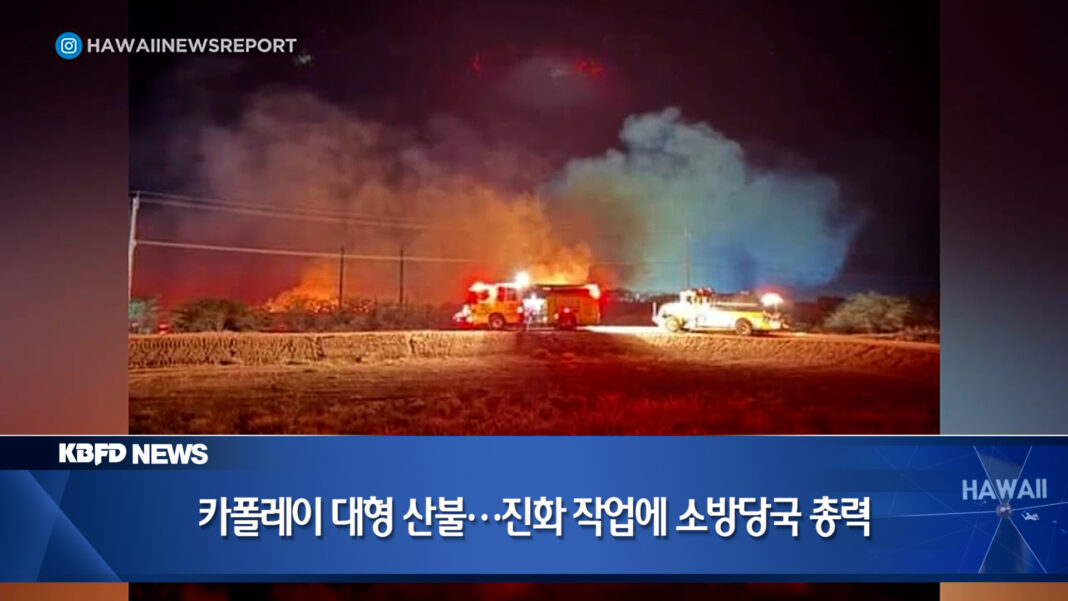 호놀룰루 소방국(HFD)은 어제 저녁 카폴레이 파크웨이 인근에서 발생한 대형 산불을 진화하기 위해 긴급 출동했습니다. 불은 24일 오후 8시 14분쯤, 카폴레이 커먼스 쇼핑센터 인근에서 최초 신고됐으며, 처음에는 쓰레기 화재로 보고됐지만, 곧 대규모 산불로 확산됐습니다. 소방 당국에 따르면, 20에이커 이상이 불에 탔고, 오늘 새벽 2시 30분 기준으로 95% 이상 진화된 상태라고 밝혔습니다. 불길은 H-1 고속도로에서도 확인될 정도로 강한 연기와 불빛을 내뿜었지만, 다행히 인근 건물이나 주택에는 위협이 없었고, 대피령도 발령되지 않았습니다. 현장에는 소방탱크차 3대와 소방차 4대가 투입돼 진화 작업이 이뤄졌습니다. 화재의 정확한 원인은 아직 밝혀지지 않았으며, 당국은 조사 중이라고 밝혔습니다.