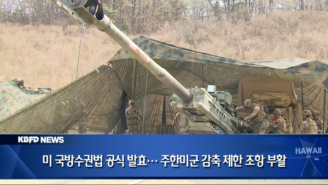 연방정부가 주한미군 병력 규모를 일방적으로 줄이지 못하도록 제한한 내년도 국방수권법, NDAA가 공식 발효했습니다. 이번 법안에는 주한미군뿐 아니라 유럽 주둔 미군 감축을 제한하는 내용과 함께, 대규모 국방 예산과 동맹국 지원 방안도 포함됐습니다.