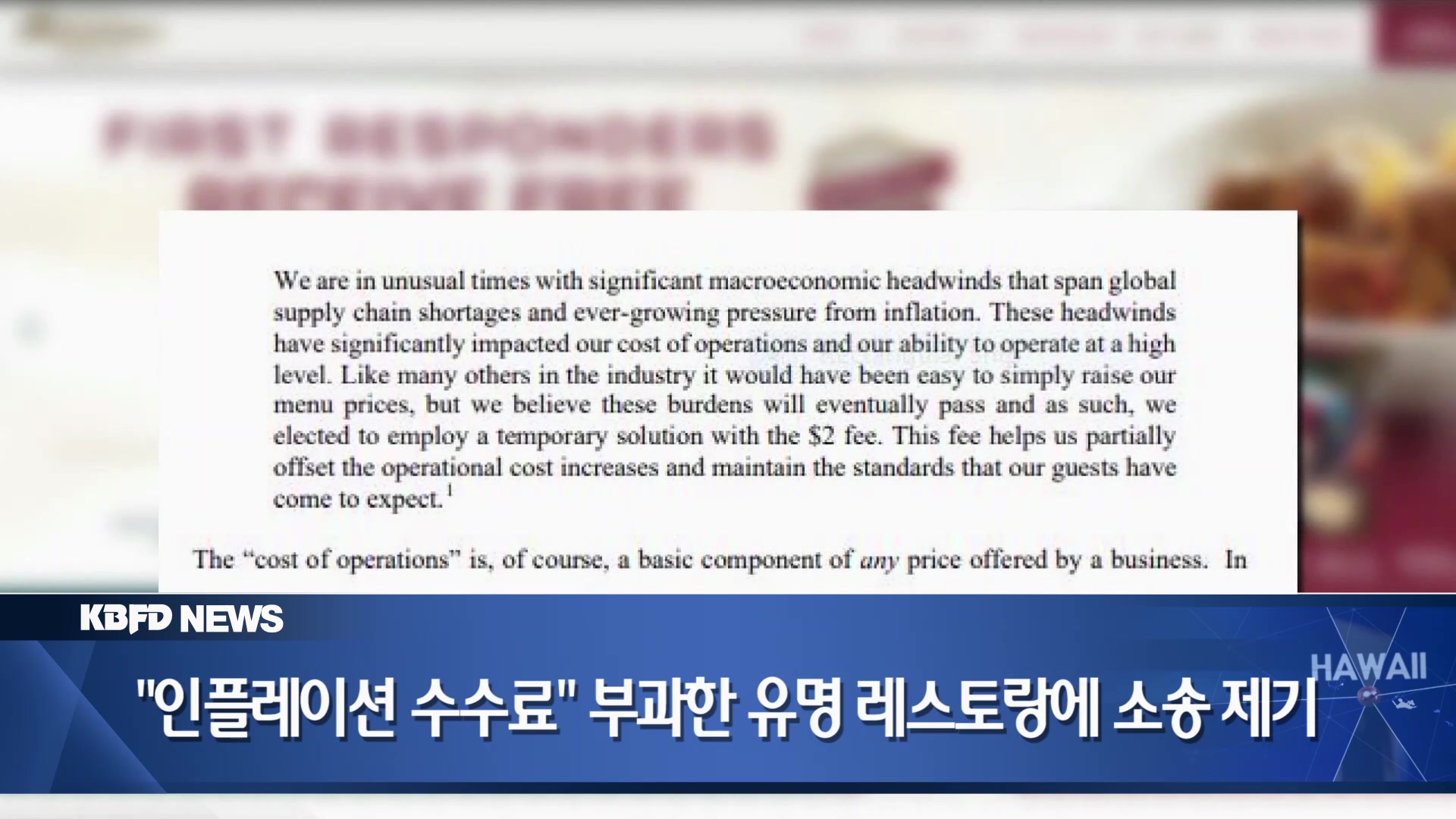 하와이의 한 변호사가 인플레이션 명목으로 고객에게 수수료를 부담시킨 유명 레스토랑 체인을 상대로 소송을 제기했습니다. 해당 변호사는 이와 유사한 레스토랑 수수료 관련 소송이 이어질 수 있다고 밝혔습니다.